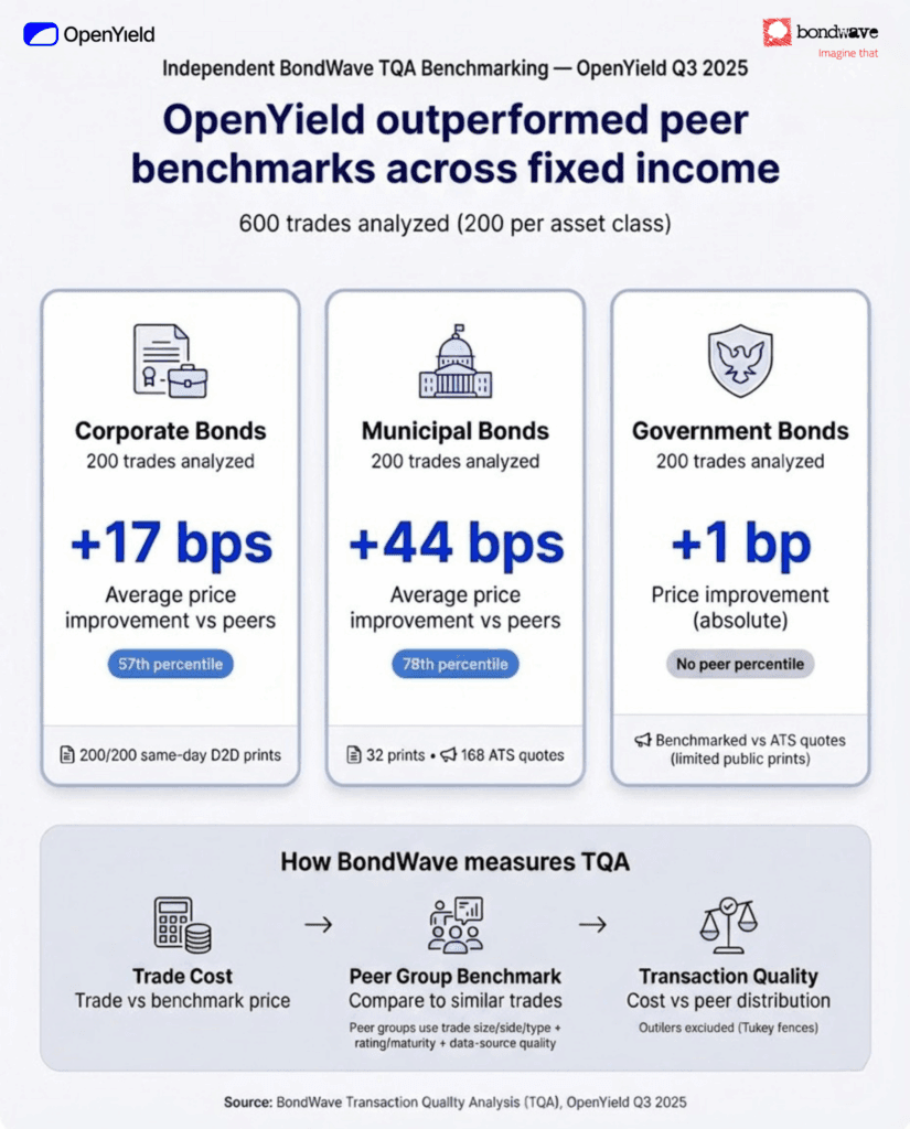 OpenYield engaged BondWave to conduct a Transaction Quality Analysis (TQA) of our Q3 2025 trading activity. Using a proprietary methodology refined over more than 20 years, BondWave benchmarked OpenYield executions against the broader market.